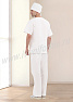 Костюм состоит из куртки и брюк. Куртка прямого силуэта с V-образным вырезом горловины, обработанной планками. На передней полочке расположены один нагрудный и два нижних накладных кармана. Горловина спинки обработана обтачкой. Рукав короткий, втачной. Брюки прямые, свободного облегания, с поясом на резинке. Для сборки костюма используются нитки в цвет ткани.
