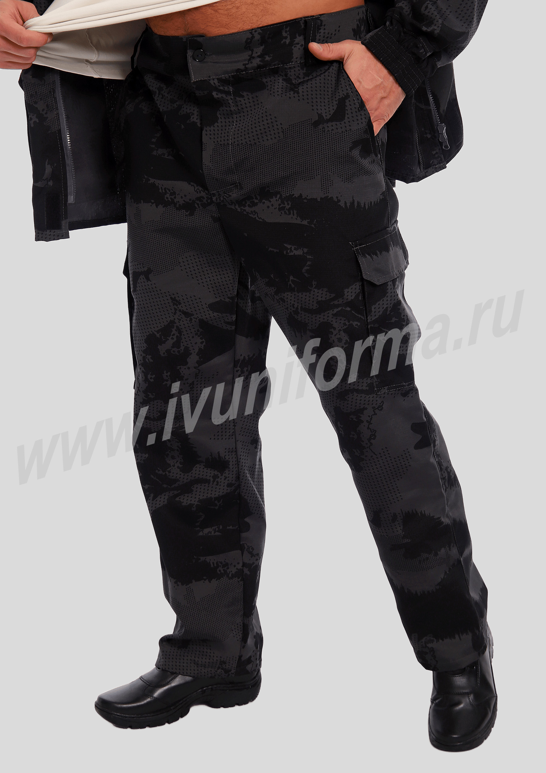 Брюки прямые с отрезным поясом, застегивающимся на одну обметанную петлю и пуговицу, с центральной застежкой-гульфик на молнии. На поясе шесть шлевок. Передние половинки брюк с двумя боковыми карманами с косым входом и двумя накладными карманами на липучках "Velcro".