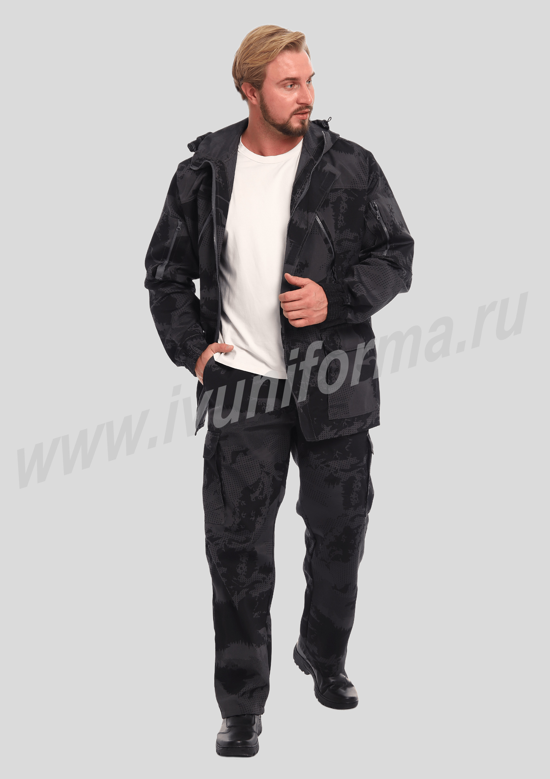 Костюм мужской состоит из куртки и брюк. Куртка удлиненная прямого силуэта, с застежкой на тракторную молнию с ветрозащитным клапаном на липучках "Velcro", воротник-стойка. На куртке два нагрудных кармана с косым входом на молнии и два нижних накладных кармана с клапанами и застежками на липучку "Velcro". Куртка имеет капюшон с возможностью регулировки объема . На рукавах куртки расположены карманы с застёжкой на молнию.