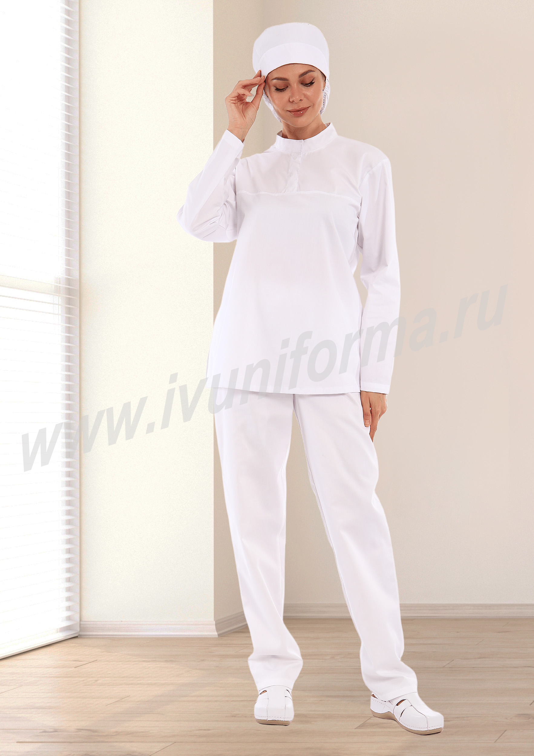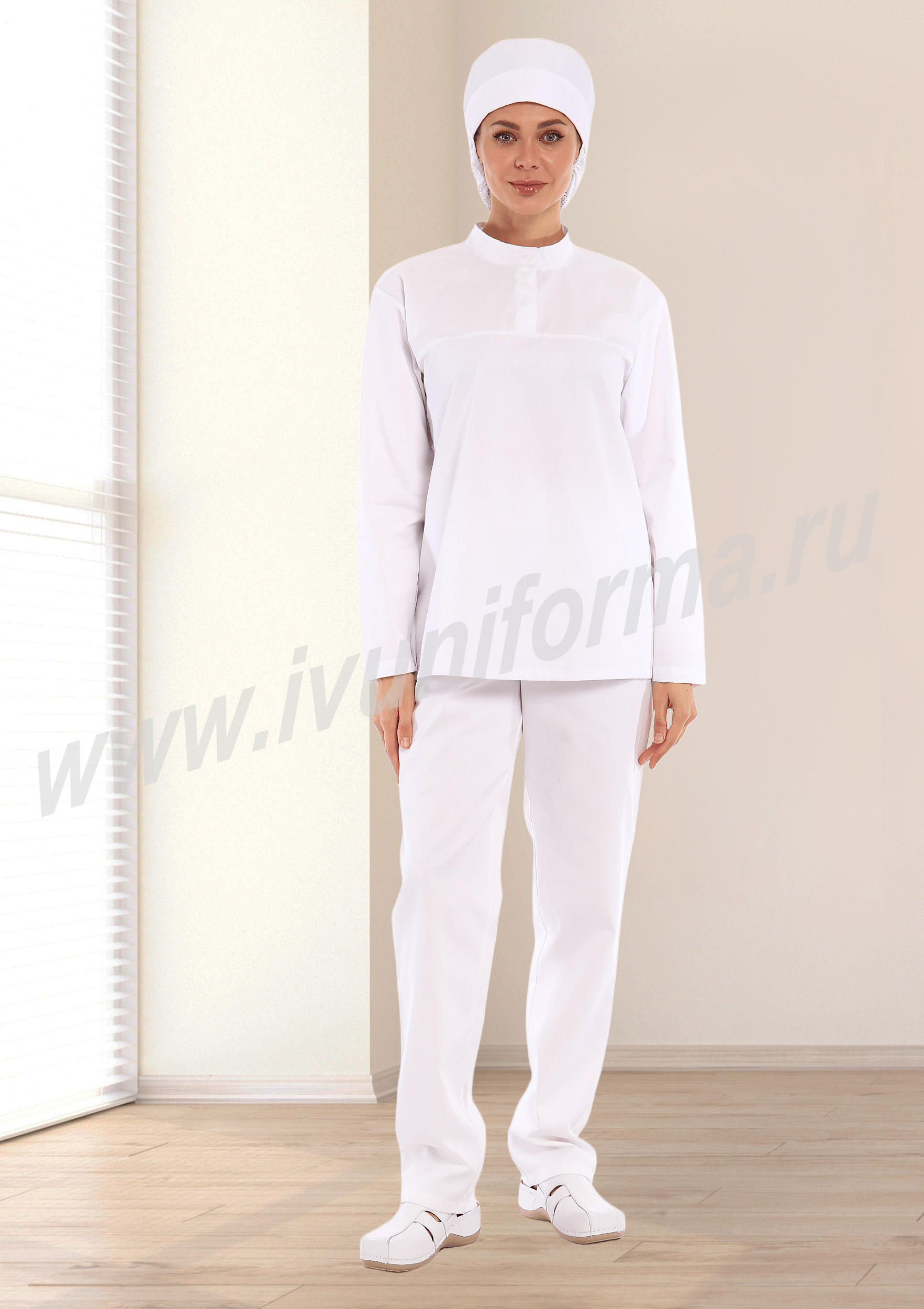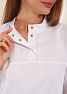 Костюм женский состоит из куртки и брюк. Куртка удлиненная прямого силуэта с центральной потайной застежкой на две кнопки. Полочка с нагрудными вытачками, с отрезными кокетками. Спинка прямая. Рукав втачной длинный, прилегание рукава по низу регулируется кнопками. Воротник стойка с потайной застежкой на кнопку обеспечивает изоляцию кожных покровов в области шеи. В боковых швах куртки предусмотрены разрезы для легкого доступа в карманы брюк. Брюки прямые на эластичном поясе со вставкой для комфортной посадки на талии и верхними боковыми карманами с наклонным входом. Костюм выполнен из смесовой износоустойчивой ткани, с повышенным содержанием хлопка, что полностью соответветствует требованиям к одежде для пищевой промышленности, лаборантов и фармацевтов. Костюм предназначен для защиты от общих производственных загрязнений. Модель разработана в соответствии с международными требованиями безопасности пищевого производства согласно системе НАССР (ХАССП).
